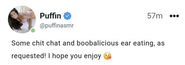 Puffin ASMR is a popular video creator known for producing a captivating array of autonomous sensory meridian response (ASMR) content on platforms like YouTube and Twitch. With a dedicated subscriber base of approximately 184K on YouTube and a following of 33,425 on Instagram, Puffin ASMR offers a unique blend of auditory experiences designed to soothe and relax. The channel showcases an impressive library of 174 videos that cover a wide range of ASMR styles, from sci-fi role plays like "Preparing You For Space (Starfield Waiting Room)" to personal attention scenarios such as ASMR sleep clinics and ear exams. Puffin's content is characterized by its high-quality soundscapes featuring extra-sensitive sounds, mouth sounds, tapping, scratching, and whispers, which appear to have resonated well with viewers, garnering views in the hundreds of thousands for multiple videos. Apart from producing video content, Puffin ASMR also engages with the community through social media, with an Instagram account that provides a closer look into their personal interests, such as plants, animals, and gaming. Recently, Puffin has expanded their presence to Twitch to offer live ASMR sessions, providing fans with real-time interaction. Their innovative approach and engaging personality have endeared them to a growing audience, making Puffin ASMR a standout figure in the ASMR community. The unique, personal touch in Puffin's videos, such as the "ASMR My Boyfriend Trying to Give Me Tingles," showcases versatility and a willingness to experiment with the ASMR format, keeping content fresh and exciting. Through ongoing evolution and interaction with viewers, Puffin ASMR continues to be a cherished source of relaxation and enjoyment for ASMR enthusiasts worldwide. Thot influencer asmr puffin nude pictures leak. The lates content of thots twitch model puffinasmr is undressing her bottom on sex girl pictures and twitch pussy flashes leak from from February 2025 for free on bitchesgirls.com. Sexy asmr puffin gonewild. Puffinasmr lingerie images. Do you know what is real name of asmr puffin?. She is definetly F18+, but do you know what is puffinasmr age?